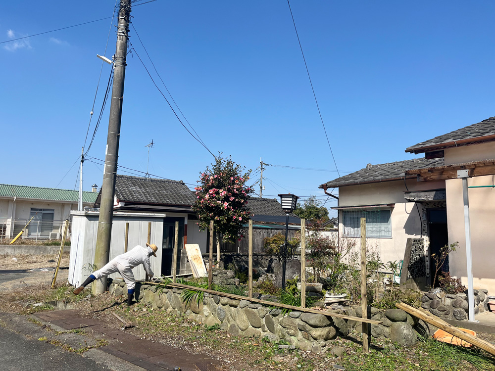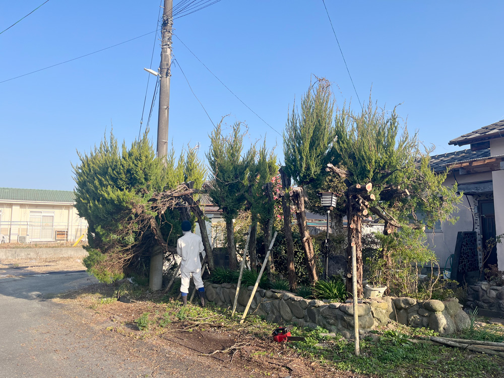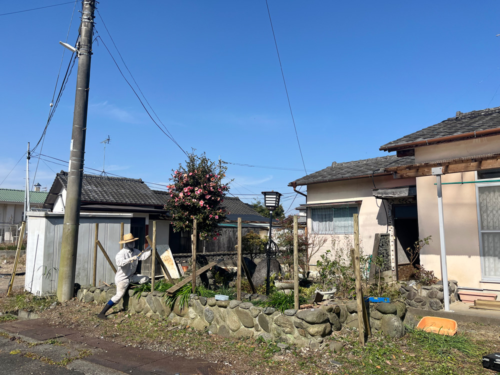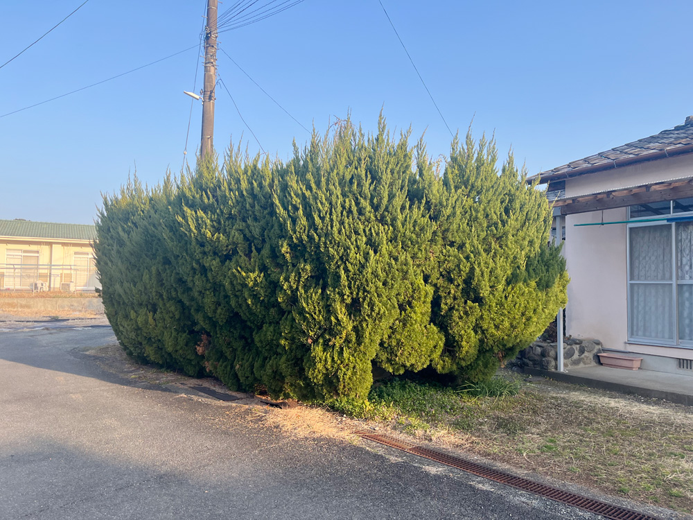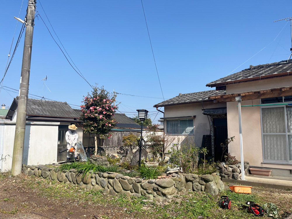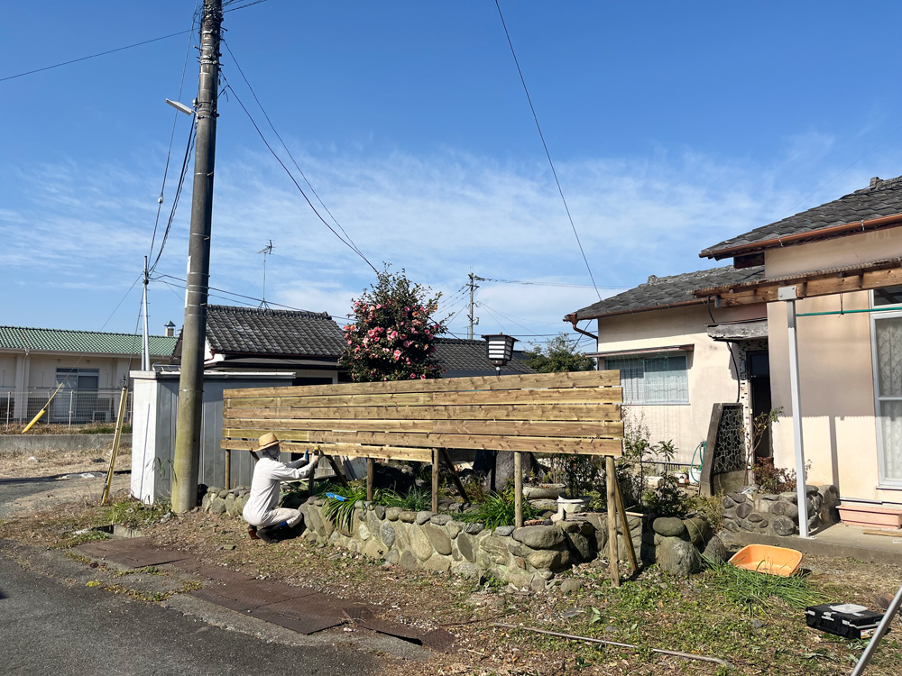 カイズカが大きくなりすぎたので伐採を行います。伐採後は、家屋の目隠し用としてウッドフェンスを取り付けることになりました。
